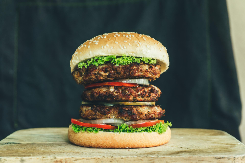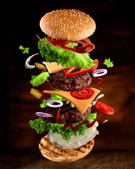 3 minced beef steaks (55g, 85% beef) layered with crunchy salad, fresh tomatoes, onions, 2 slices of cheese, and our special CS sauce.