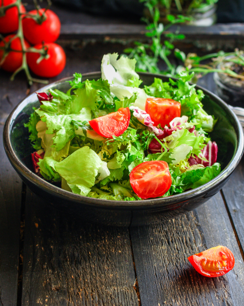 Salad composed of green salad, corn, feta, cherry tomatoes, olives, cucumber and salad dressing